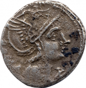 Vorderseite: ROMA. Kopf der Roma nach r., behelmt, unterhalb des Kopfes ein X; im Perlkreis.