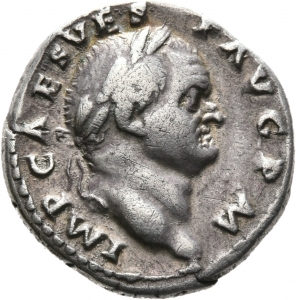 Obverse: IMP VESP AVG P M [IMPERATOR VESPASIANVS AVGVSTVS PONTIFEX MAXIMVS]. Kopf des Vespasian nach r., bekränzt; im Perlkreis.