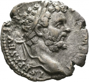 Obverse: L SEPT SEV PERT AVG IMP VII [LVCIVS SEPTIMIVS SEVERVS PERTINAX AVGVSTVS IMPERATOR VII]. Kopf des Septimius Severus nach r., bekränzt; im Perlkreis.