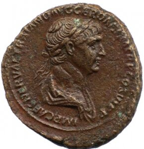 Obverse: IMP CAES NERVAE TRAIANO AVG GERM DAC P M TR P CO S VI P P [IMPERATOR CAESARI = = AVGVSTO GERMANICO DACICO PONTIFEX MAXIMVS TRIBVNICIA POTESTATE CONSVL VI PATER PATRIAE]. Büste des Traian nach r., bekränzt und drapiert; im Perlkreis.