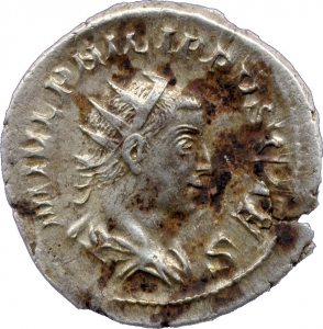 Obverse: M IVL PHILIPPVS CAES [MARCVS IVLIVS = CAESAR]. Büste des Philippus II. nach r., mit Strahlenkrone, drapiert und gerüstet; im Perlkreis.